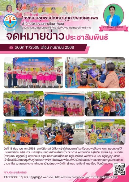 วันที่ 18 กันยายน 2568 นางฐิติมณฑ์ ฐิติไวฑูรย์ ผู้อำนวยการโรงเรียนชุมพรปัญญานุกูล มอบหมายให้ นางแสงเดือน ตรีนันทวัน รองผู้อำนวยการฝ่ายบริหารงานวิชาการ พร้อมด้วยคุณครูโสภิน สุพรม คุณครูเปรมฤทัย โกงขุนทดคุณครูศุภณัฐ ผลพฤกษา คุณครูชนันชิดา ชวงศ์วัฒนา