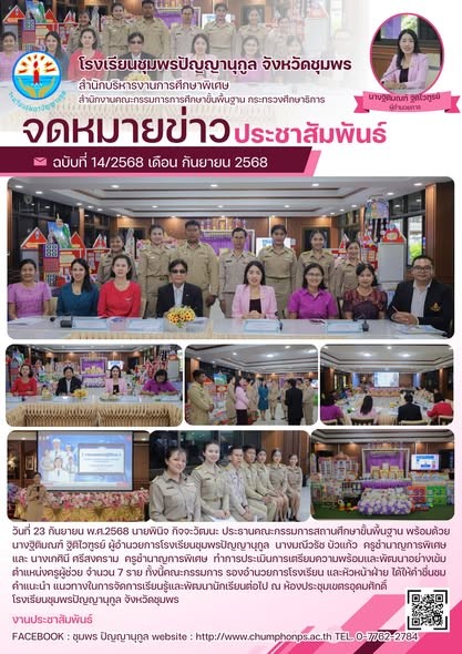 วันอังคาร ที่ ๒๓ กันยายน พ.ศ. ๒๕๖๘ นายพินิจ กิจจะวัฒนะ ประธานคณะกรรมการสถานศึกษา พร้อมด้วย นางฐิติมณฑ์ ฐิติไวฑูรย์ ผู้อำนวยการโรงเรียนชุมพรปัญญานุกูล นางมณีวรัช บัวแก้ว ครูชำนาญการพิเศษ นางเกศินี ศรีสงคราม ครูชำนาญการพิเศษ