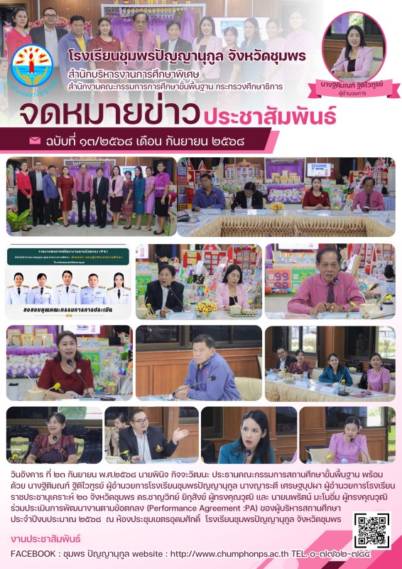 วันอังคาร ที่ ๒๓ กันยายน พ.ศ. ๒๕๖๘ นายพินิจ กิจจะวัฒนะ ประธานคณะกรรมการสถานศึกษา พร้อมด้วย นางฐิติมณฑ์ ฐิติไวฑูรย์ ผู้อำนวยการโรงเรียนชุมพรปัญญานุกูล นางญาระตี เศรษฐบุปผา ผู้อำนวยการโรงเรียนราชประชานุเคราะห์ ๒๐