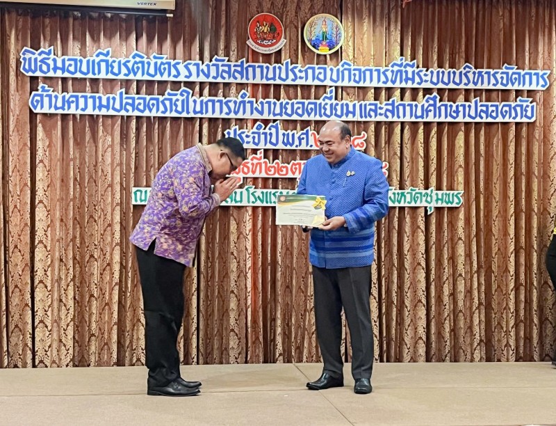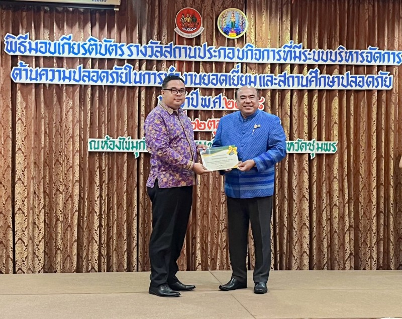 เข้าร่วมพิธีมอบเกียรติบัตรสถานประกอบกิจการที่มีระบบบริหารจัดการด้านความปลอดภัยในการทำงานยอดเยี่ยมและสถานศึกษาปลอดภัย ประจำปี พ.ศ.2568 ณ ห้องไข่มุกไพลิน โรงแรมชุมพรการ์เดน จังหวัดชุมพร |