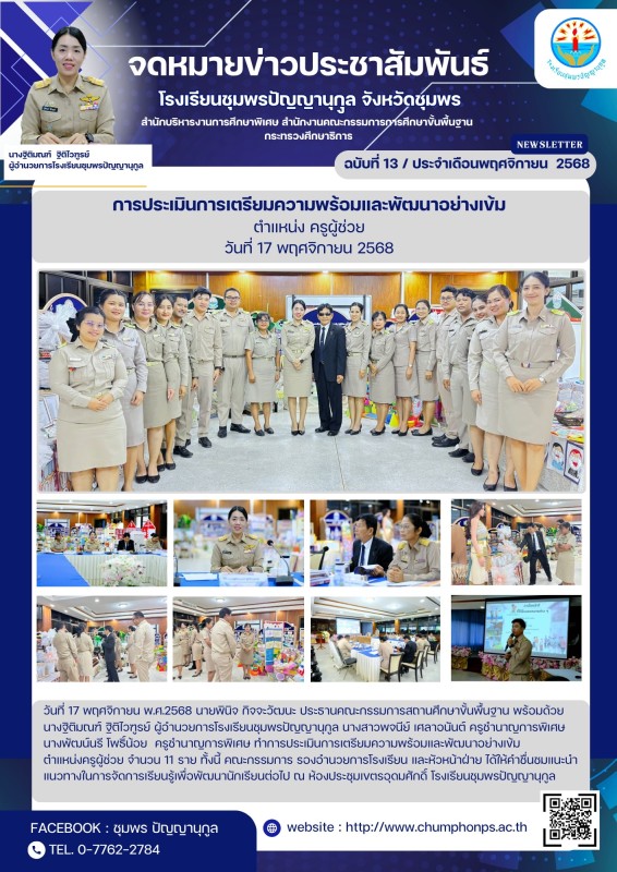 วันที่ 17 พฤศจิกายน พ.ศ.2568 นายพินิจ กิจจะวัฒนะ ประธานคณะกรรมการสถานศึกษาขั้นพื้นฐาน พร้อมด้วย นางฐิติมณฑ์ ฐิติไวฑูรย์ ผู้อำนวยการโรงเรียนชุมพรปัญญานุกูล นางสาวพจนีย์ เศลาอนันต์ ครูชำนาญการพิเศษ นางพัฒน์นรี โพธิ์น้อย ครูชำนาญการพิเศษ