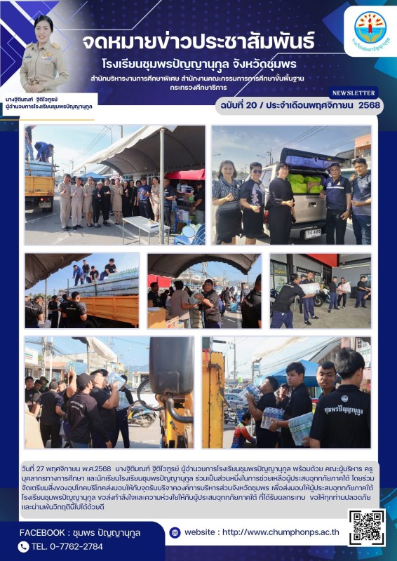 วันพฤหัสบดีที่ 27 พฤศจิกายน 2568 นางฐิติมณฑ์ ฐิติไวฑูรย์ ผู้อำนวยการโรงเรียนชุมพรปัญญานุกูล พร้อมด้วย คณะผู้บริหาร ครู บุคลากรทางการศึกษา และนักเรียนโรงเรียนชุมพรปัญญานุกูล ร่วมเป็นส่วนหนึ่งในการช่วยเหลือผู้ประสบอุทกภัยภาคใต้