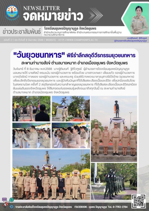 วันที่ 8 ธันวาคม 2568 นางฐิติมณฑ์ ฐิติไวฑูรย์ ผู้อำนวยการโรงเรียน มอบหมายให้ นายศิลป์ พรมแม้น รองผู้อำนวยการโรงเรียน พร้อมด้วยนางสาวเกษรา เลี่ยมแก้ว รองผู้อำนวยการโรงเรียน นางจุไรรัตน์ กาลออง รองผู้อำนวยการโรงเรียน และคณะครู ร่วมพิธีวางพวงมาลาอนุสาวรีย์วี