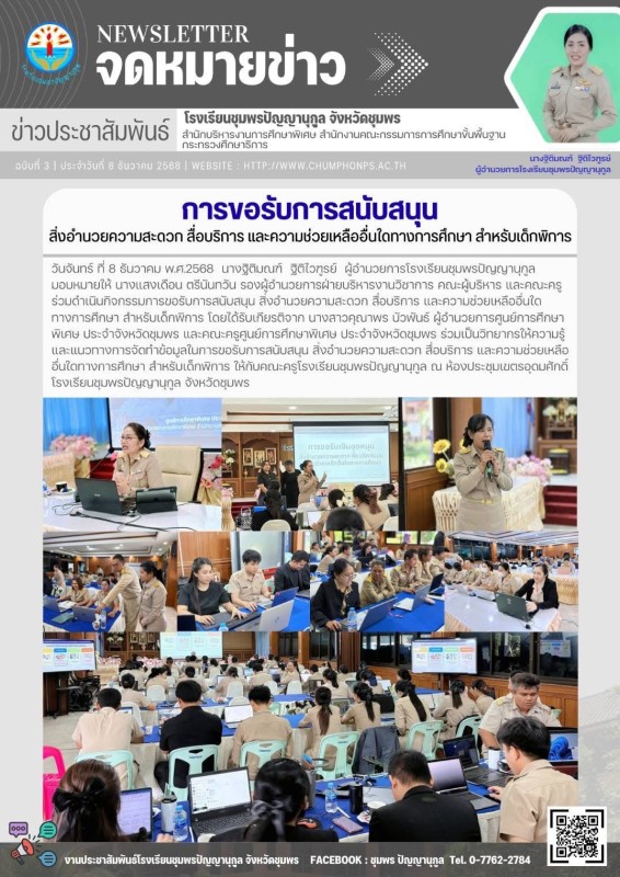 วันที่ 8 ธันวาคม 2568 นางฐิติมณฑ์ ฐิติไวฑูรย์ ผู้อำนวยการโรงเรียน มอบหมายให้ นางแสงเดือน ตรีนันทวัน รองผู้อำนวยการโรงเรียน คณะผู้บริหาร และคณะครู ร่วมดำเนินกิจกรรมการขอรับการสนับสนุน สิ่งอำนวยความสะดวก สื่อบริการ และความช่วยเหลืออื่นใดทางการศึกษา