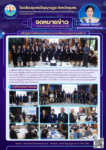 ระหว่างวันที่ 3-7 มกราคม พ.ศ.2569 นางฐิติมณฑ์ ฐิติไวฑูรย์ ผู้อำนวยการโรงเรียนชุมพรปัญญานุกูล พร้อมด้วย ผู้บริหาร และคณะครู เข้าร่วมอบรมหลักสูตรการฝึกอบรมนักแนะแนวอาชีพและสอนงานคนพิการ (Job Coach for Person with Disability) ของกรมพัฒนาฝีมือแรงงาน