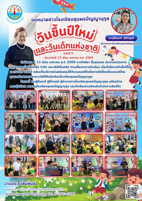 วันพุธที่ 13 เดือน มกราคม พ.ศ. 2569 คุณทัศนียา ลิ้มอุดมพร ประธานกรรมการบริษัทชุมพรโอเชี่ยนกรุ๊ป จำกัด และบริษัทในเครือ ร่วมเลี้ยงอาหารนักเรียน เนื่องในโอกาสวันขึ้นปีใหม่และวันเด็ก 2569