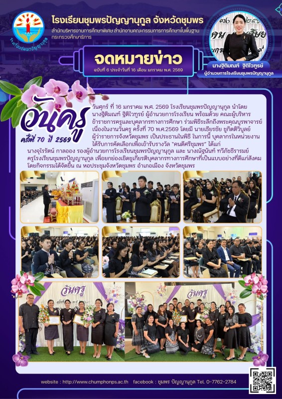 วันศุกร์ ที่ 16 เดือนมกราคม พ.ศ. 2569 นางฐิติมณฑ์ ฐิติไวฑูรย์ ผู้อำนวยการโรงเรียนชุมพรปัญญานุกูล พร้อมด้วย คณะผู้บริหาร คณะครูโรงเรียนชุมพรปัญญานุกูล ร่วมพิธีระลึกถึงพระคุณบูรพาจารย์ เนื่องในวันครู ครั้งที่ 70 ประจำปี 2569