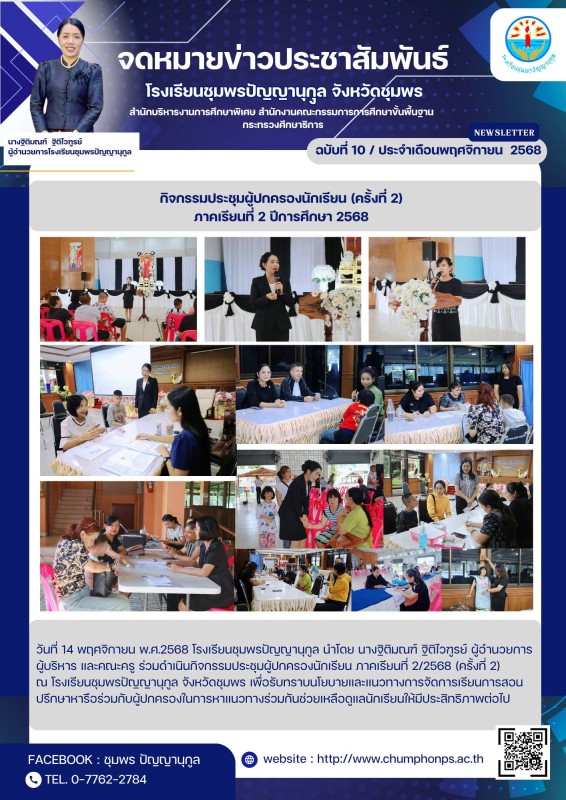 วันที่ 14 พฤศจิกายน พ.ศ.2568 โรงเรียนชุมพรปัญญานุกูล นำโดย นางฐิติมณฑ์ ฐิติไวฑูรย์ ผู้อำนวยการ ผู้บริหาร และคณะครู ร่วมดำเนินกิจกรรมประชุมผู้ปกครองนักเรียน ภาคเรียนที่ 2/2568 (ครั้งที่ 2)