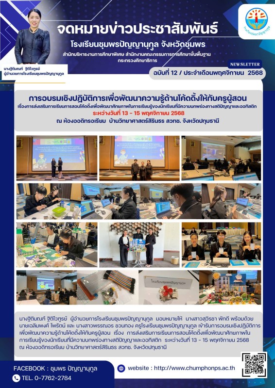 นางฐิติมณฑ์ ฐิติไวทรย์ ผู้อำนวยการโรงเรียนชุมพรปัญญานุกูล มอบหมายให้ นางสาวสุวิรชา พักดี พร้อมด้วย นายเฉลิมพงศ์ ไพรัตน์ และ นางสาวพรรณอร ชวนทอง ครูโรงเรียนชุมพรปัญญานุกูล เข้ารับการอบรมเชิงปฏิบัติการเพื่อพัฒนาความรู้ด้านโค้ดดิ้งให้กับครูผู้สอน