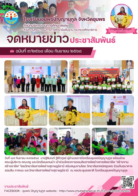 11 ก.ย.68 นางฐิติมณฑ์ ฐิติไวฑูรย์ ผู้อำนวยการโรงเรียนชุมพรปัญญานุกูล เป็นประธานในพิธีกล่าวเปิดงาน "กิจกรรมอบรมเสริมทักษะสำหรับครูและนักเรียนแกนนำทักษะอาชีพอิสระและงานบริการ" โดยมีนางสาวเกษรา เลี่ยมแก้ว รองผู้อำนวยการ กล่าวรายงานการดำเนินกิจกรรม