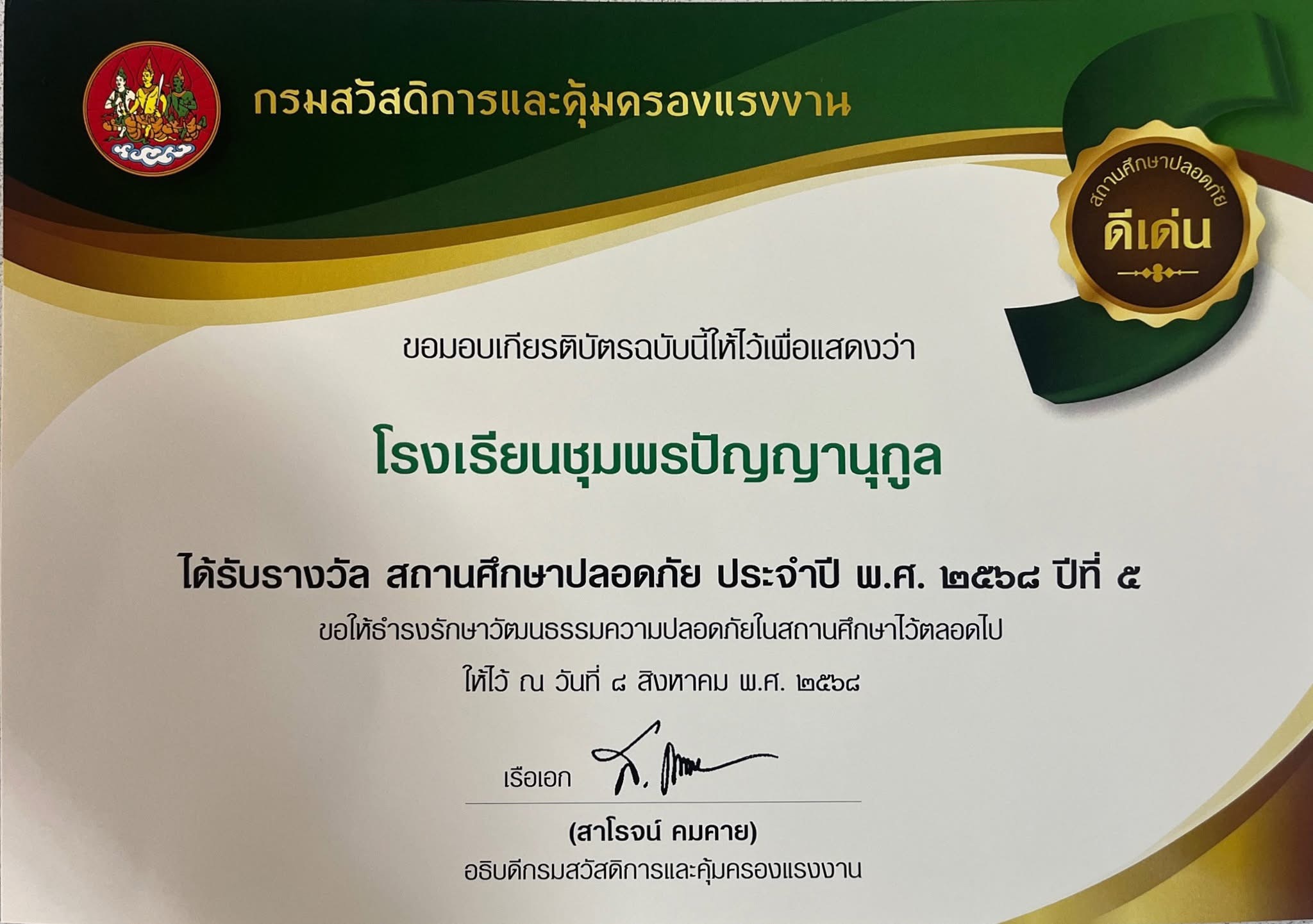 ขอแสดงความยินดีกับ โรงเรียนชุมพรปัญญานุกูล ที่ได้รับเกียรติบัตรดีเด่นติดต่อกันปีที่ ๕ รางวัลสถานศึกษาปลอดภัย ประจำปี พ.ศ. ๒๕๖๘ 18 ส.ค. 68