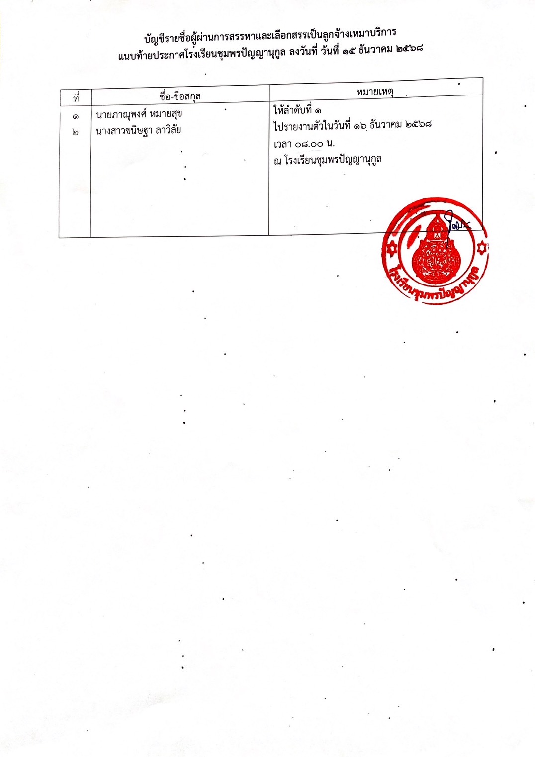 ประกาศโรงเรียนชุมพรปัญญานุกูล เรื่อง รายชื่อผู้ผ่านการสรรหาและเลือกสรรเป็นลูกจ้างเหมาบริการ ประจำปีงบประมาณ 2568