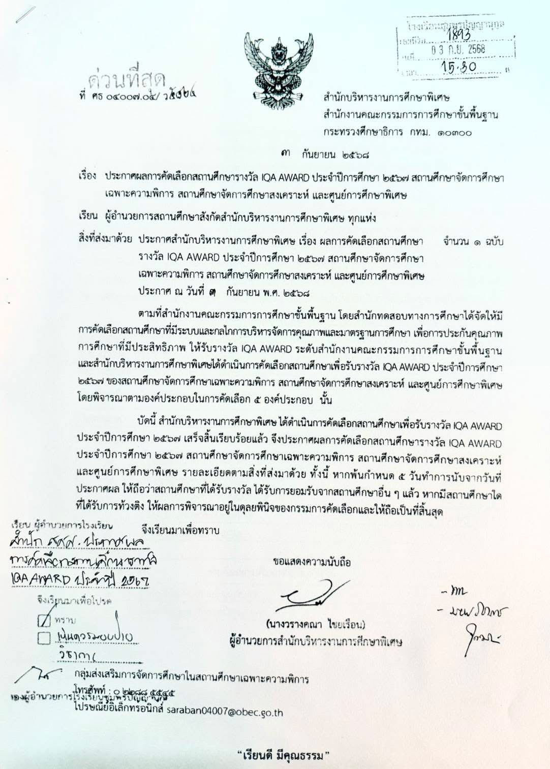 ขอแสดงความยินดีกับโรงเรียนชุมพรปัญญานุกูล ที่ได้รับเกียรติบัตรดีเด่น การคัดเลือกสถานศึกษารางวัล IQA AWARD ปีการศึกษา ๒๕๖๗ สถานศึกษาเฉพาะความพิการ